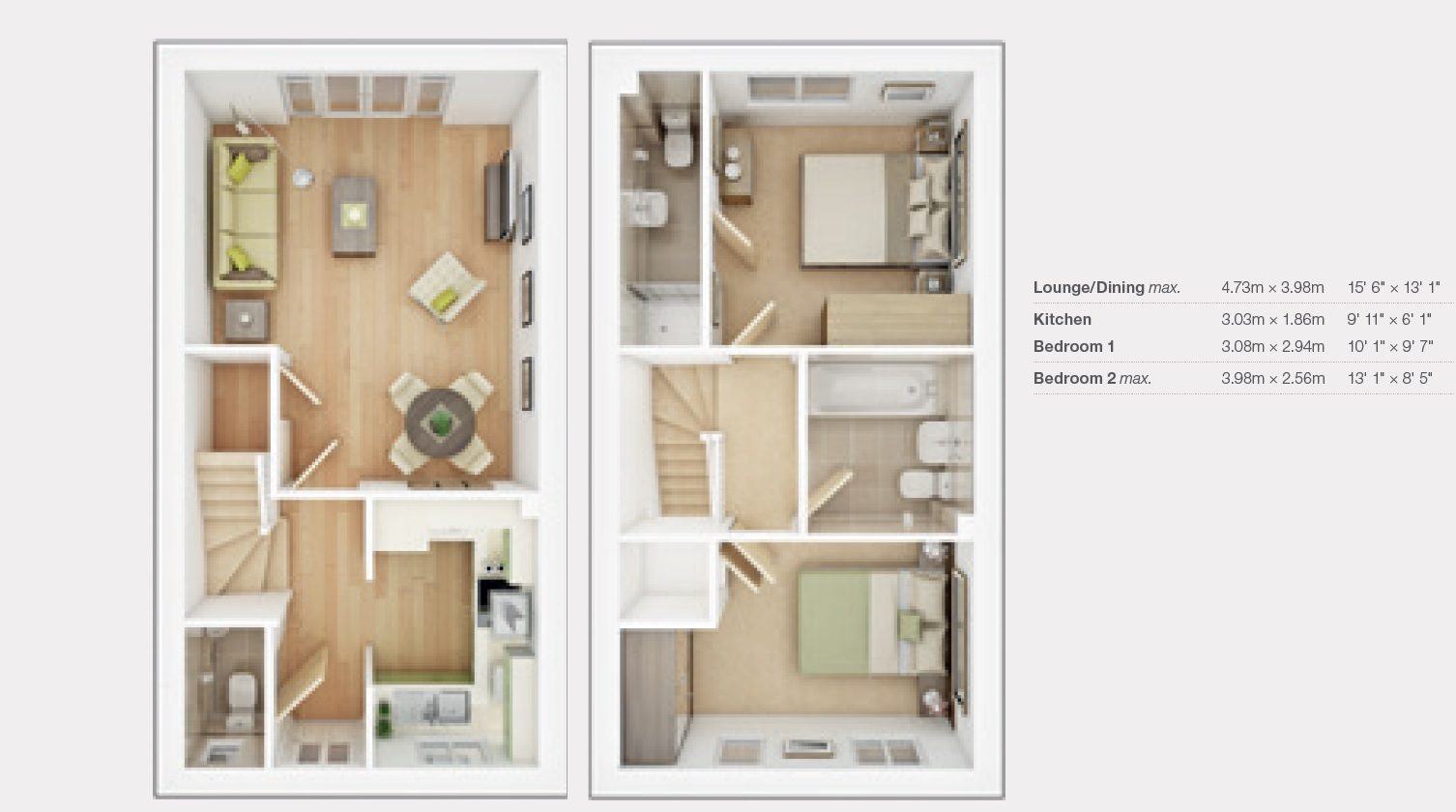 Two bedroom end terrace homes comprising on the ground floor, entrance hall, cloakroom, kitchen, lounge/dining room; the first floor includes two double bedrooms (master bedroom with ensuite) and family bathroom. The property also has 2 off road parking spaces.